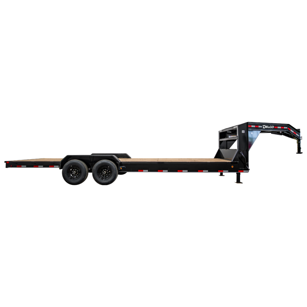 The C8 takes the popular 83-inch wide deck and puts it on a gooseneck hitch for superior stability on longer lengths. Twelve length configurations from 16 to 40 feet make this one of the most flexible equipment haulers in the Delco lineup — from a tight 16-footer to a full 40-foot commercial rig.