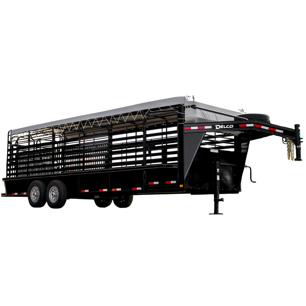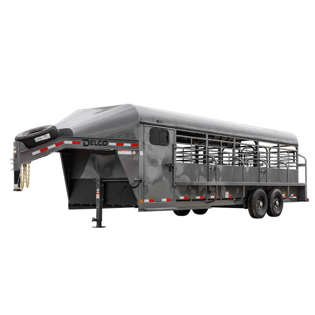 Delco’s Gooseneck Livestock lineup covers every hauling need from small hobby farms to large commercial ranching operations. The gooseneck hitch provides superior stability, higher weight ratings, and better towing performance for serious livestock haulers.
